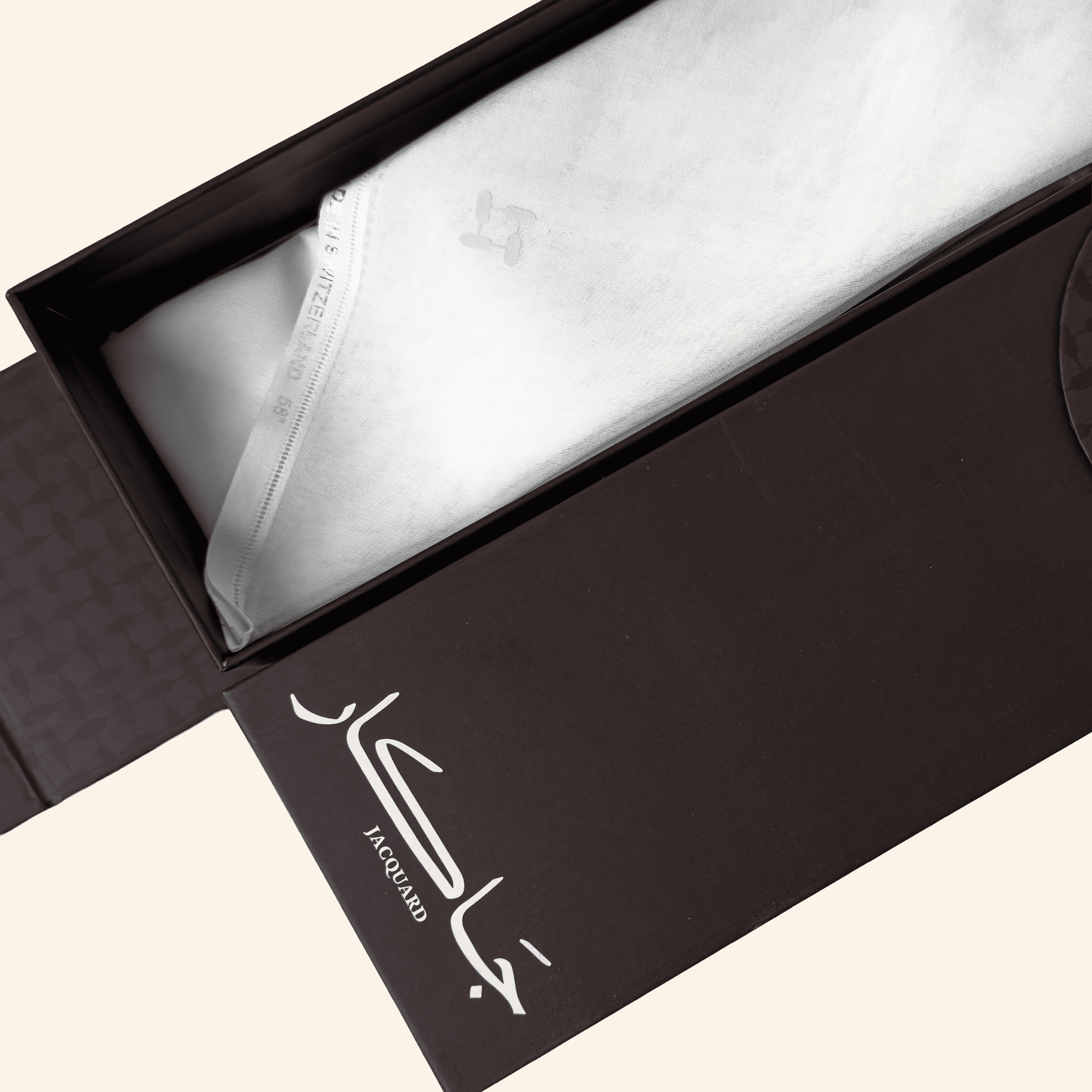 اكتشف الغترة البيضاء الكلاسيكية من جاكار، المصنوعة بعناية في سويسرا من قطن فاخر 100%. صُممت لتمنحك ملمسًا ناعمًا، ونسيجًا متقنًا، وأناقة يومية متوازنة